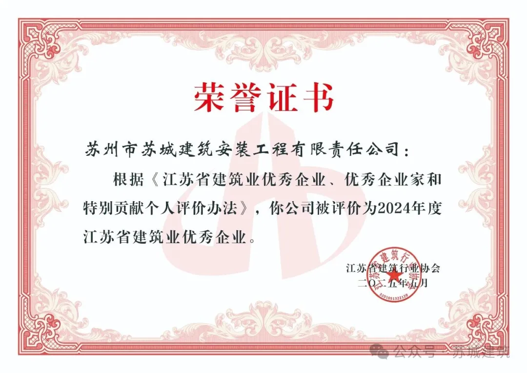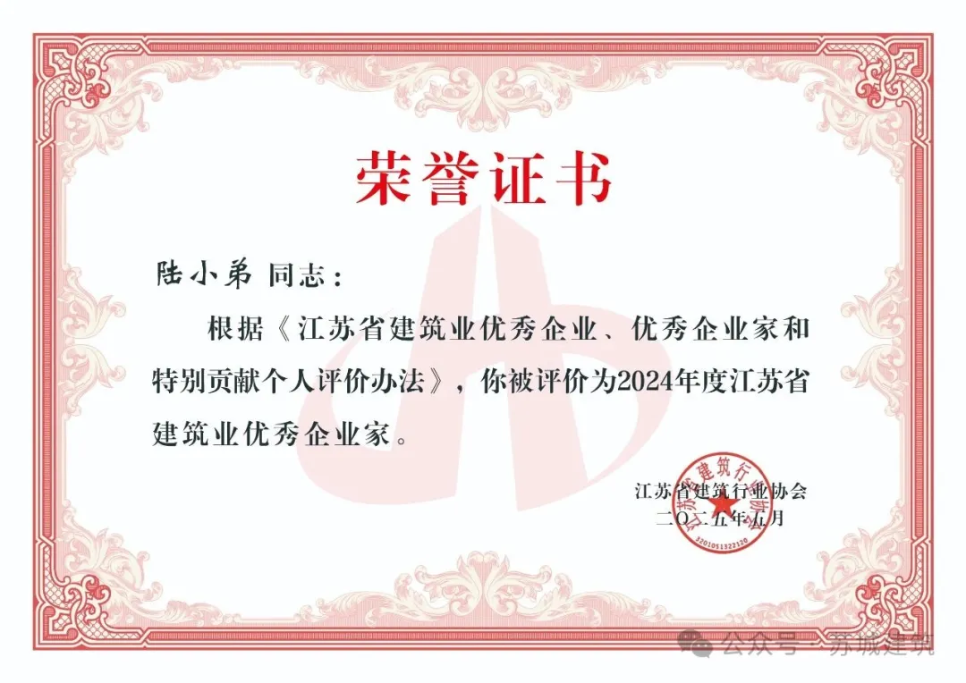 在近日公布的江蘇省建筑業(yè)年度評優(yōu)中,蘇州市蘇城建筑安裝工程有限公司榮獲“江蘇省建筑業(yè)優(yōu)秀企業(yè)”稱號,董事長陸小弟先生獲評“江蘇省優(yōu)秀企業(yè)家”!雙項榮譽,彰顯卓越!同時我們衷心感謝各級領(lǐng)導(dǎo)的關(guān)懷指導(dǎo)與社會各界朋友們的鼎力支持。這一"雙優(yōu)"榮譽的獲得,不僅是對蘇城建筑在行業(yè)深度調(diào)整中保持穩(wěn)健發(fā)展的充分肯定,更是對我們四十多年來深耕建筑領(lǐng)域、堅持創(chuàng)新發(fā)展的最佳褒獎!
